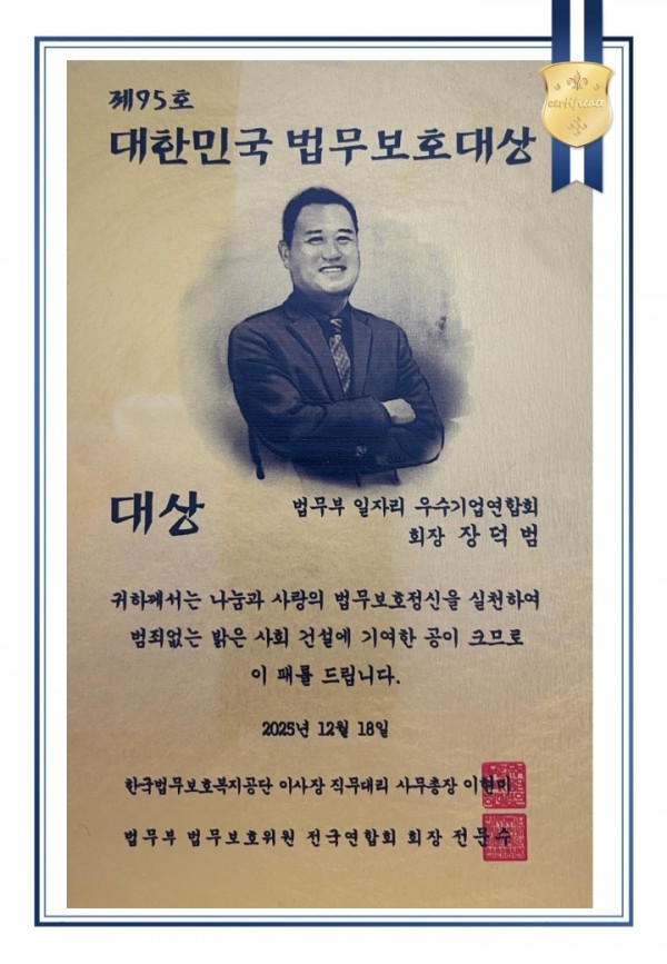 ▲ 대한민국 법무보호대상 [대상] / 법무부 일자리 우수기업연합회 회장(장덕범)